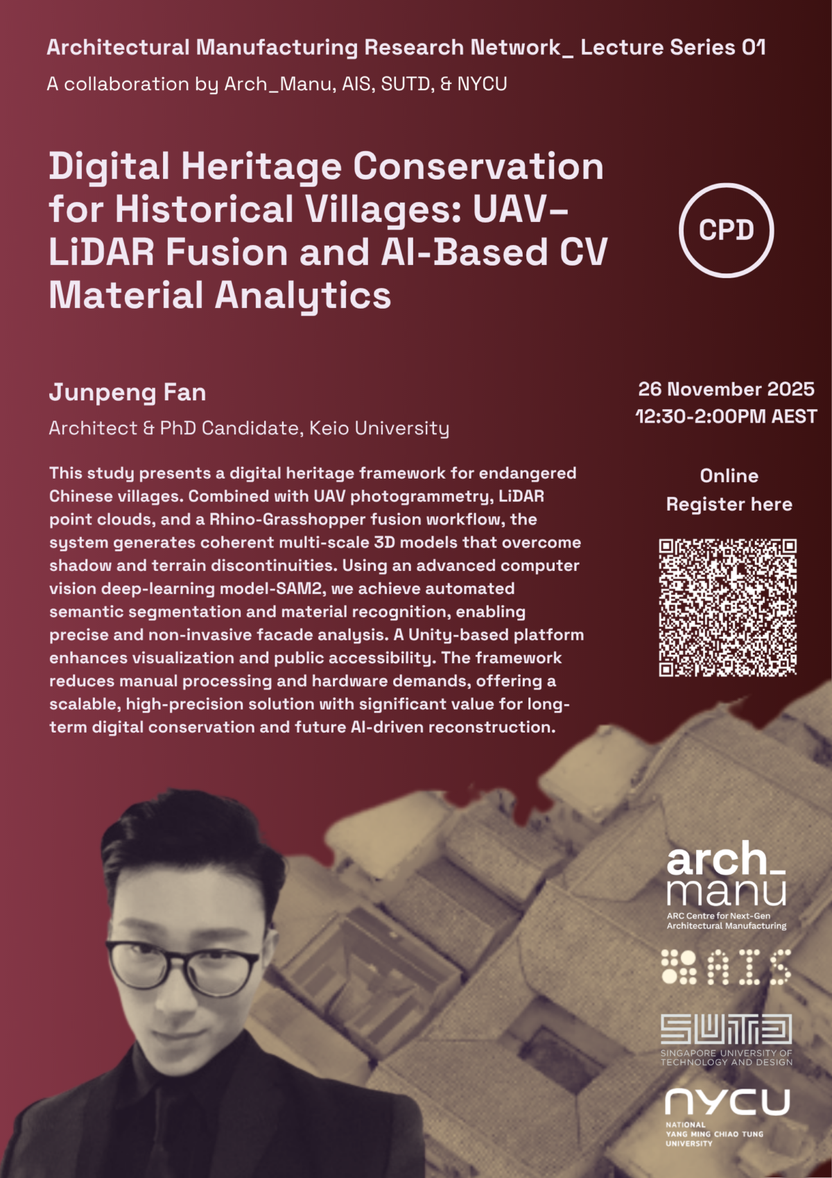 11月26日(水) 午前10:30-12:00に開催される第1回セッションでは、慶応大学博士課程Junpeng Fan氏を講師として”Digital Heritage Conservation for Historical Villages: UAV–LiDAR Fusion and AI-Based CV Material Analytics“の研究発表(英語)を行います。